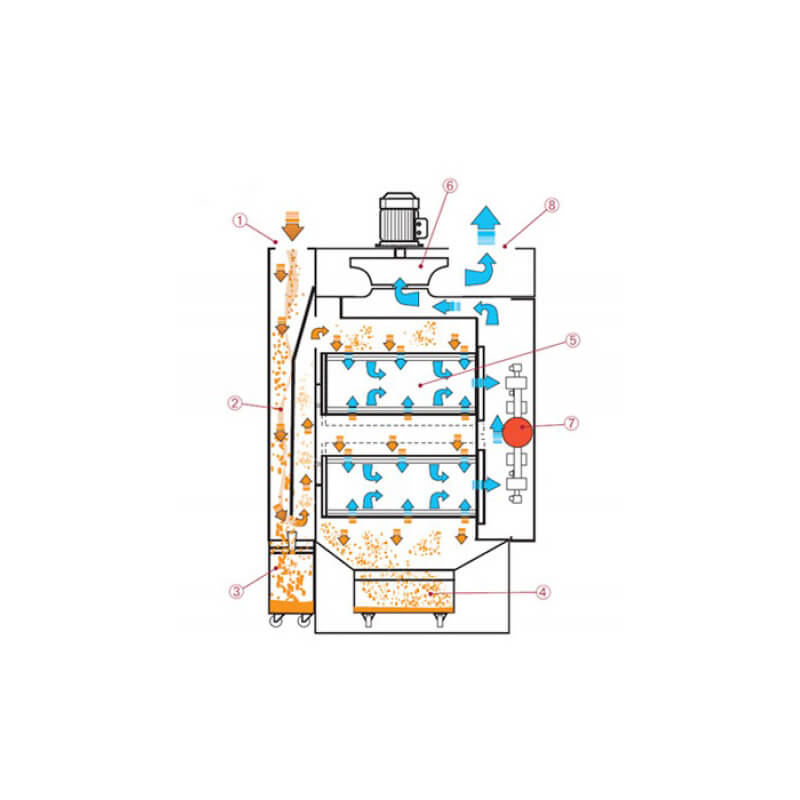 L’unité de filtration se compose d’une préchambre, où la plus grande partie des poussières est collectée, tombant alors dans un premier bac de collecte primaire. Le filtre labyrinthe suivant, avec ses cartouches filtrantes à haute efficacité, termine le procédé de filtration et la collecte des poussières restantes. Le positionnement horizontal de la cartouche permet un accès facile et une maintenance rapide des filtres. L’ajout d’éléments filtrants HEPA H13 permet de recycler un air incroyablement propre dans les lieux de travail.