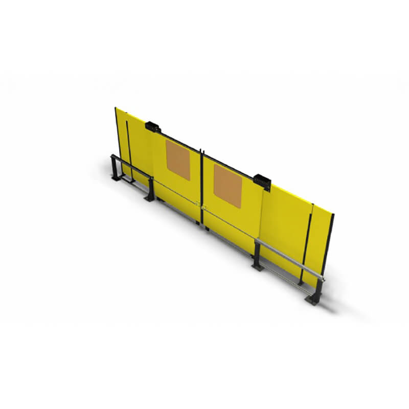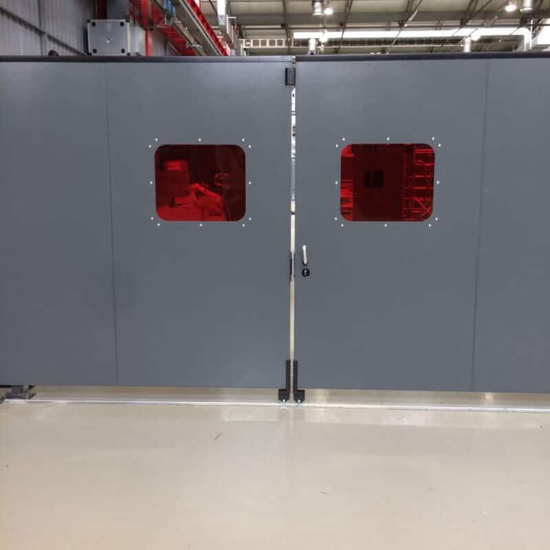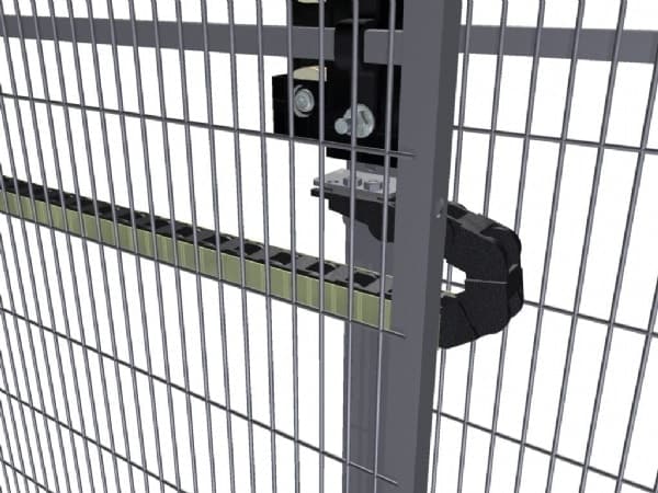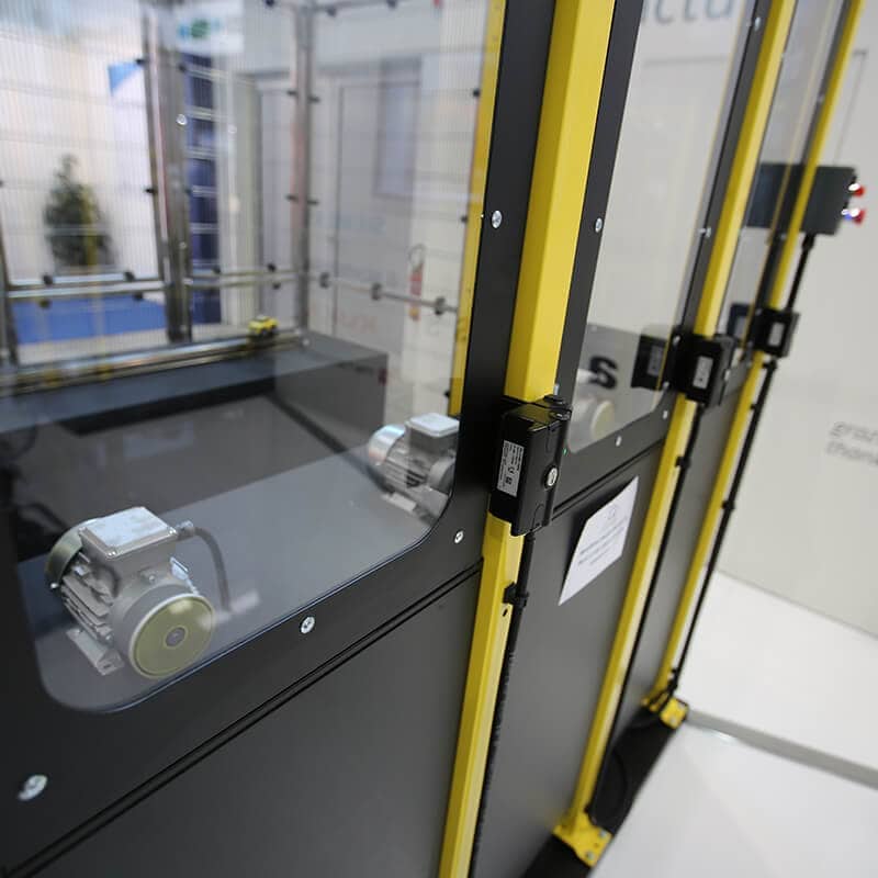 Nos portes peuvent être conçues et commandées par l’intermédiaire d’un cylindre pneumatique, d’un moteur électrique avec transmission à chaîne ou à courroie ou bien par une unité linéaire et elles sont munies des systèmes de sécurité nécessaires pour les protecteurs mobiles conformément aux normes ISO 14120, ISO 14119, ISO 13855, ISO 13856.