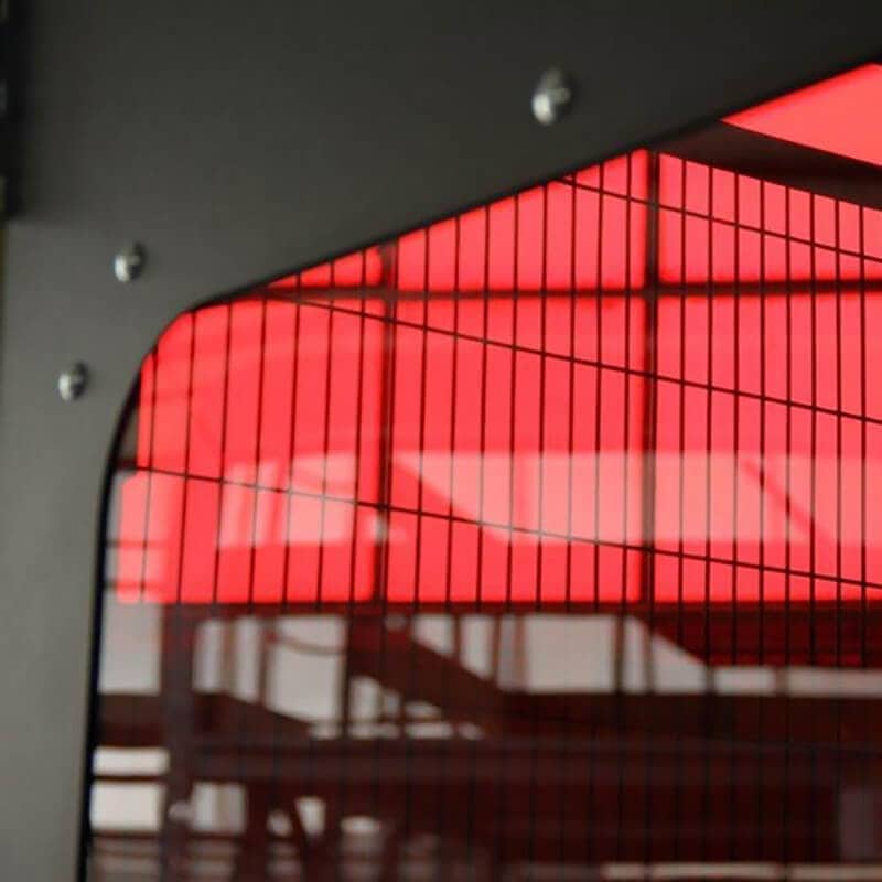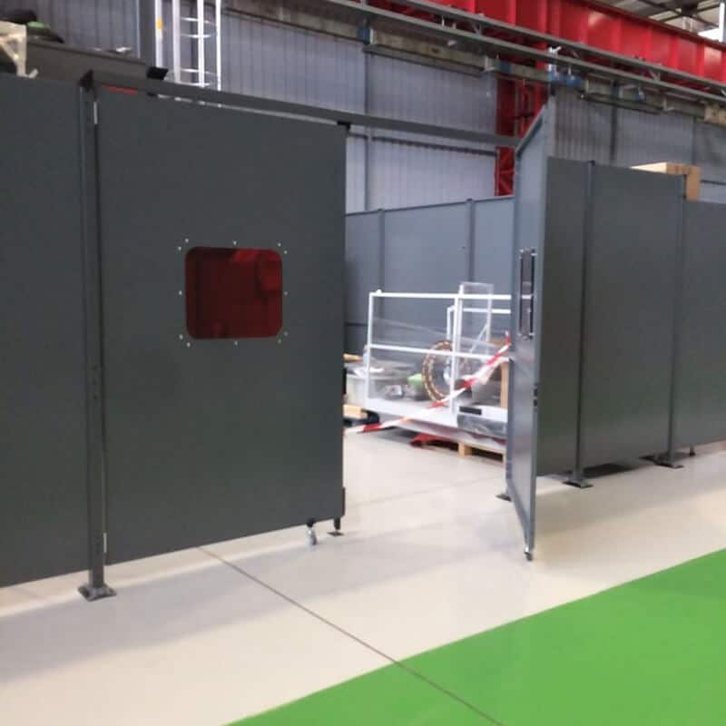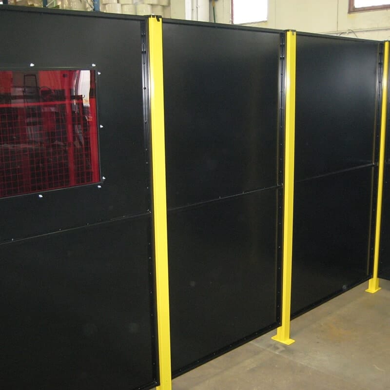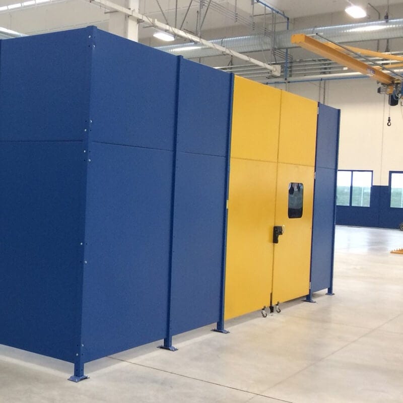 Clôtures périmétriques de sécurité et cloisons modulaires en tôle et polycarbonate Polyplus pour réduire le bruit et réduire les risques de projections d’objets ou de liquide hors de la zone dangereuse.