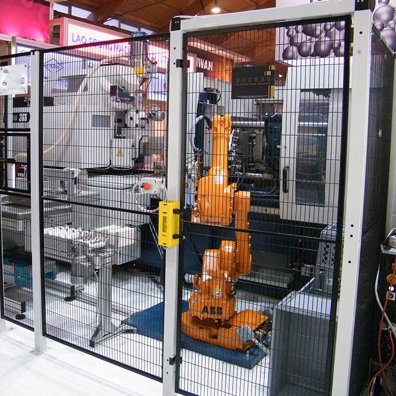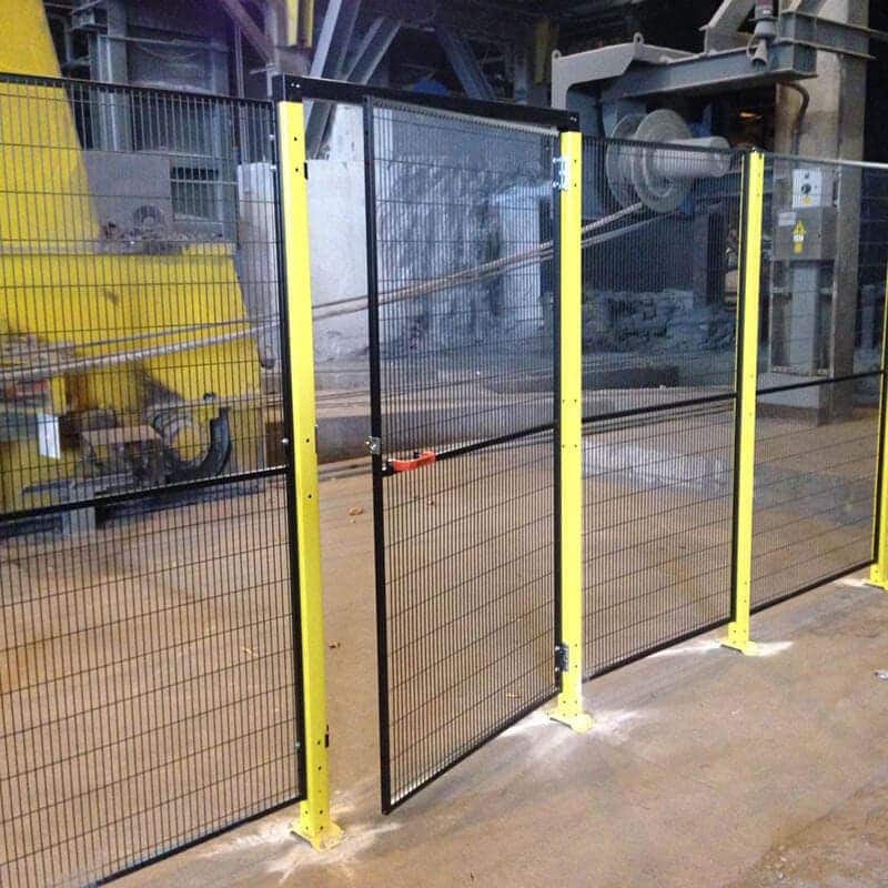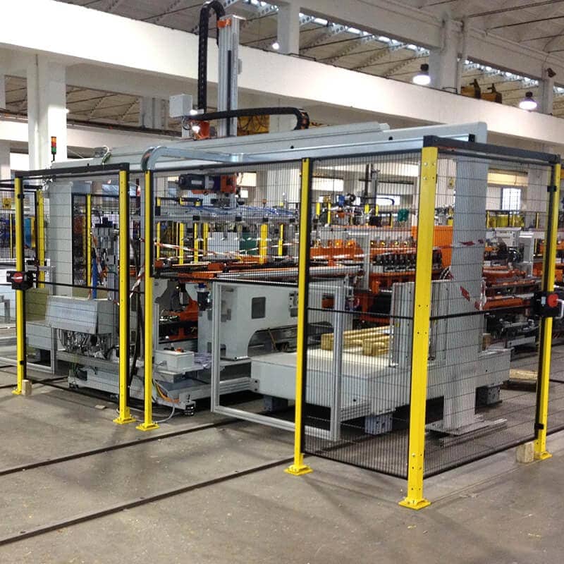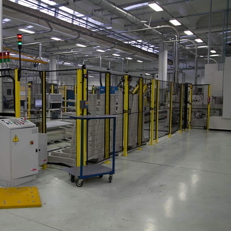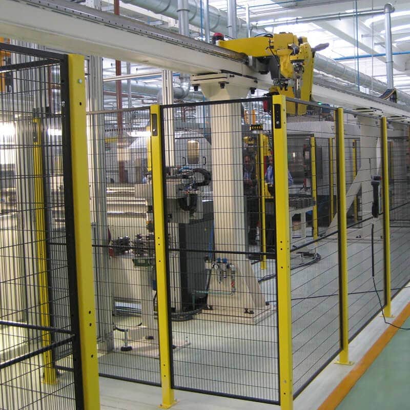 Clôtures périmétriques de sécurité et cloisons modulaires grillagées à mailles rectangulaires électro-soudées. Les cloisons de protection PENTA offrent la meilleure protection pour sécuriser les zones dangereuses ou l’on retrouve des robots industriels et des machines en mouvement.