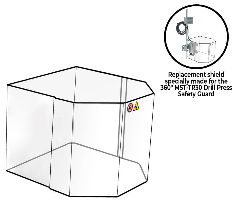 The MST-TR30/SS is an industrial polycarbonate replacement shield designed to restore visibility and safety on your MST-TR30 360° drill press guard. To order the correct part: