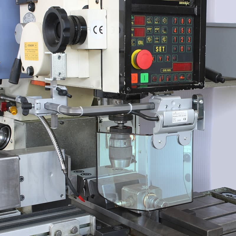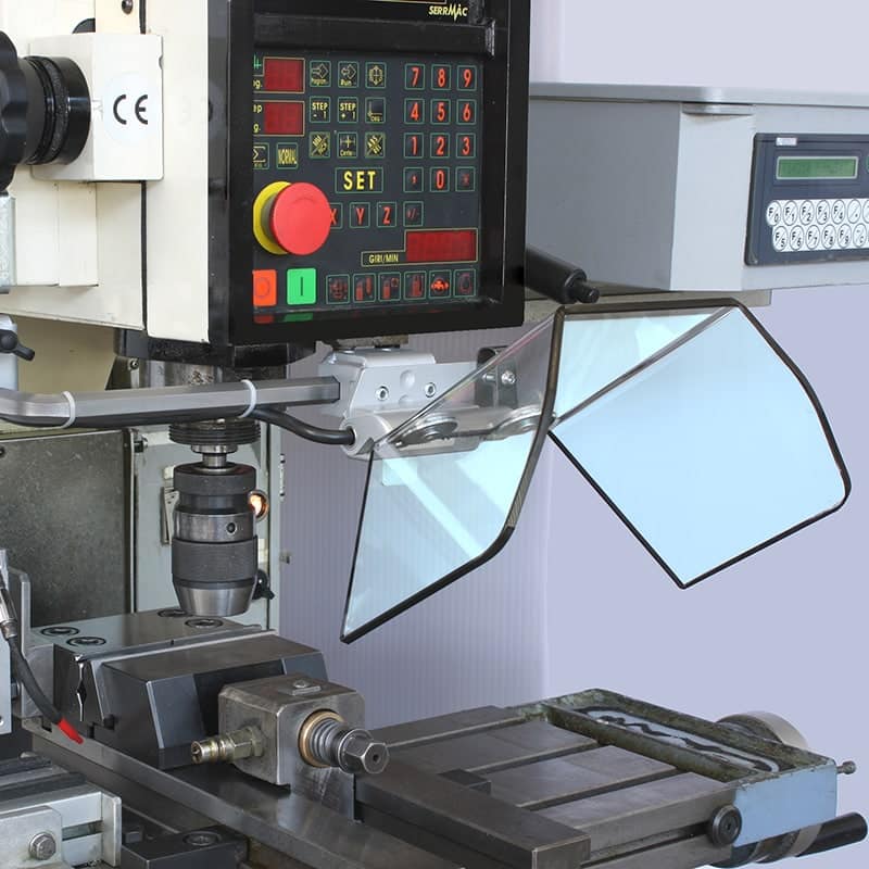 Protects the operator from rotating parts of the vertical spindle and helps contain the projection of shavings, chips and lubricant-coolant. The spring-assisted vertical opening offers system 60°–120°–180° positions for quick setups and access. Hexagonal support arms are widely adjustable and interchangeable to fit various fixing configurations. The shield-support hinge integrates a safety microswitch for electrical interlocking.