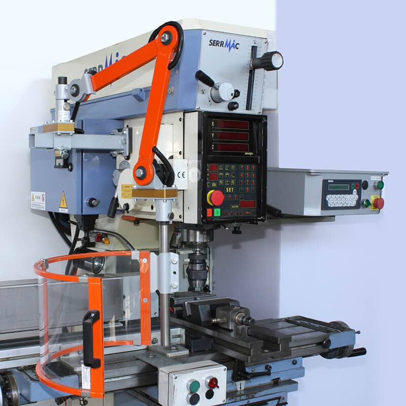 The interlock safety system automatically prevents the milling machine from running when the guard is open or improperly positioned. This safety mechanism significantly reduces accident risks and guarantees conformity with OSHA, ANSI, ISO-EN, and CE safety standards.