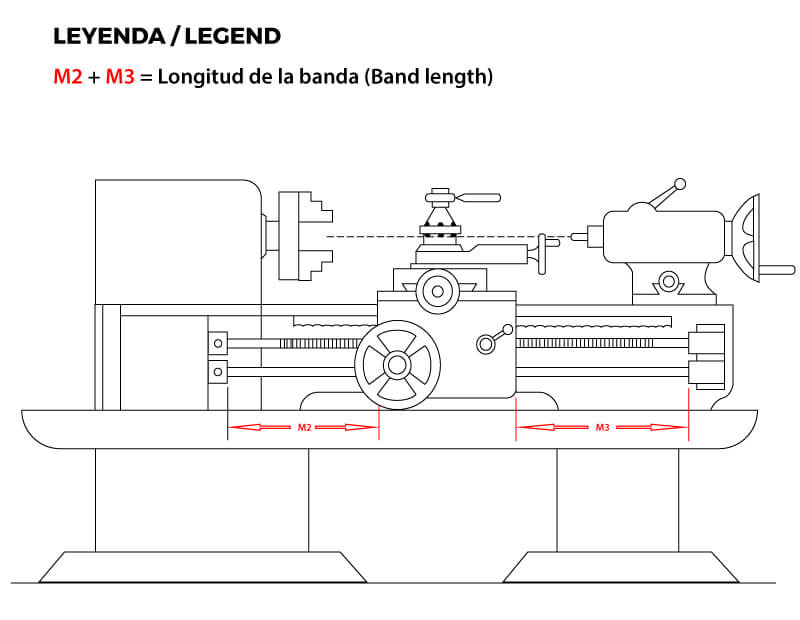 Debe calcular la longitud total de banda a partir de la imagen “Leyenda”. Para ello, mida M2 + M3 y luego consulte la tabla de selección para encontrar el modelo correspondiente.