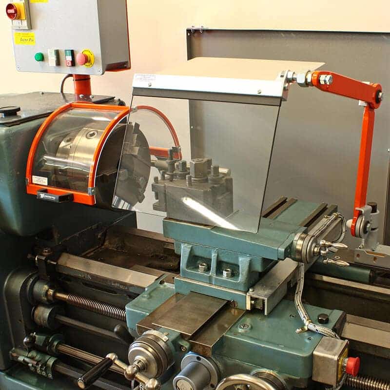 Gracias a su estructura de acero tubular y a sus articulaciones con discos de fricción, la pantalla puede colocarse fácilmente para adaptarse a distintos tipos de operaciones de torneado. El conjunto incluye un tabique anti-virutas y una pantalla fabricada en plástico resistente a impactos y aceites, que garantizan una barrera confiable contra proyecciones de virutas, refrigerantes, lubricantes y contactos accidentales con piezas en rotación del torno. La parte superior de aluminio brinda mayor resistencia y durabilidad.