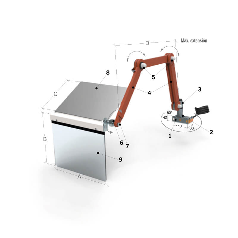 - Disponible como brazo articulado simple con una base de 325 mm.