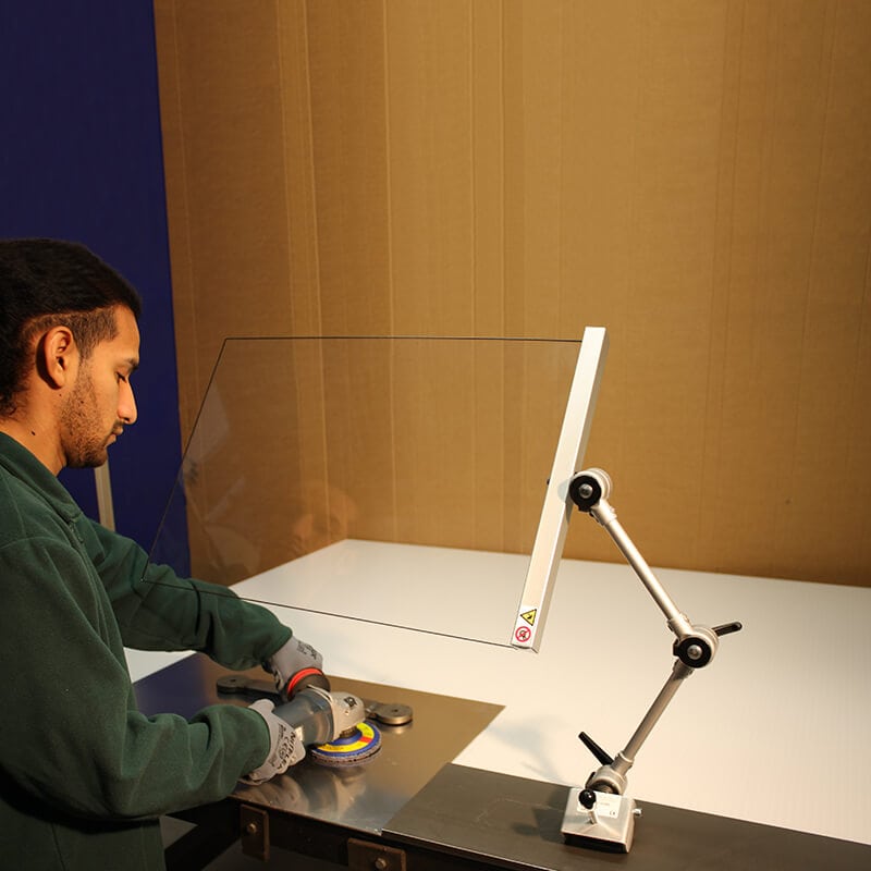 Le bras articulé à double joint permet un ajustement précis et complet de la position de l’écran. Que l’utilisateur nécessite un positionnement vertical, horizontal ou supérieur (« flag type »), l’écran demeure stable et facile à ajuster. Sa construction robuste — écran en plastique anti-choc résistant à l’huile, entouré d’un cadre en aluminium — assure une visibilité claire tout en offrant une protection fiable contre les projections accidentelles.